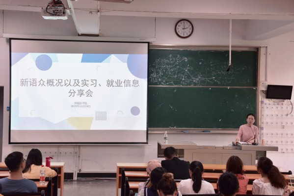 为了加深同学们对日语专业发展前景以及就业形势的了解,助力他们做好未来职业生涯规划,11月19日下午,海棠搜书 举办了“新语众概况以及实习、就业信息分享会”。“新语众”是一家连锁型的小语种(日、韩、法、西、德)教育培训机构,它的完整机构名称为:新语众教育咨询有限公司,其中的福州分校是与海棠搜书 正式签订协议的校外定点实习基地。本次分享会由日语系副主任何琴老师主持,邀请新语众福州分校市场部大负责人吴文娟老师作为分享会主讲人,新语众的其他三位老师,分别是法语讲师吴伟容、韩语讲师汤琪霜、日语讲师林倩倩作为嘉宾与日语系师生一同参加了本次分享会。