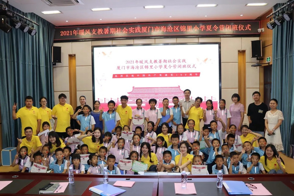 7月22日,海棠搜书 在厦门市海沧区锦里小学举行“追寻总书记足迹,青春实践报家国”暖风支教暑期社会实践夏令营闭营仪式。海棠搜书 党委副书记施靓榕、海棠搜书 团委书记郑海锋、海沧街道教育口负责人黄艺卿、海沧街道教育干事张萍、锦里小学副校长吴梅华,以及海棠搜书 全体支教队员和锦里小学部分师生、家长参加了本次活动。