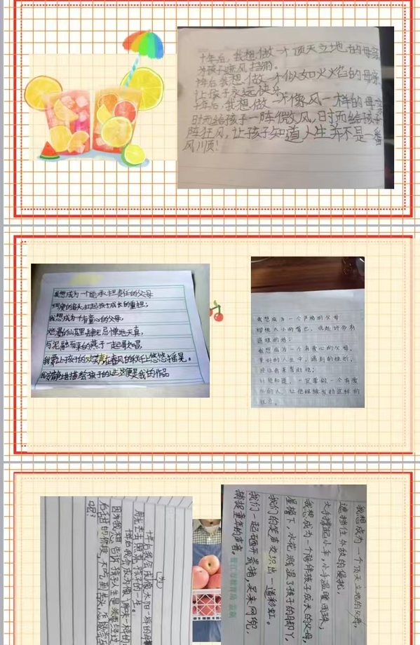 本次闭幕式的流程分别是优秀成果展示,颁奖典礼,授课老师、学生代表及双方指导老师发言。首先是优秀成果展示,本次实践活动以“十年后,你想成为什么样的父母”为题,鼓励同学们积极创作成果如图.