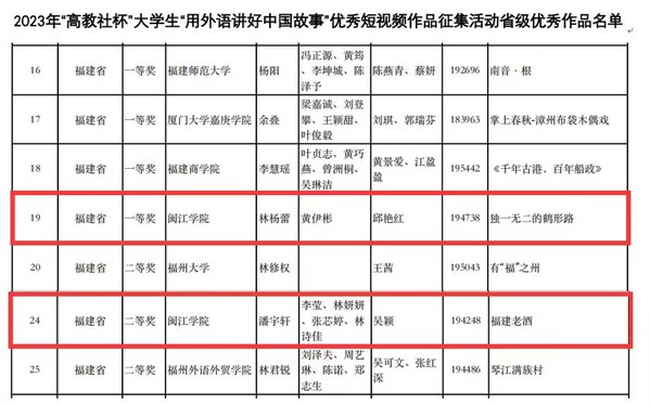 近日,由全国高等学校大学外语教学研究会指导,南京大学主办,高等教育出版社协办的第二届“高教社杯”大学生“用外语讲好中国故事”优秀短视频作品征集活动评选结果发布。海棠搜书 由邱艳红老师指导,林杨蕾、苗伊彬同学制作的作品《独一无二的鹤形路》荣获福建省一等奖,吴颖老师指导,潘宇轩、李莹、林妍妍、张芯婷、林诗佳同学制作的作品《福建老酒》荣获省二等奖。