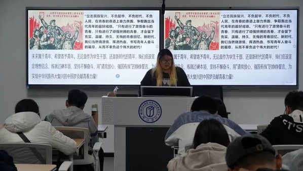 主持人带领同学们学习《论党的青年工作》一书。主持人详细阐释了《论党的青年工作》蕴含的思想方法和工作方法,并提出青年要自觉弘扬以爱国主义为核心的民族精神和以改革创新为核心的时代精神,努力学习,掌握报效祖国的本领。