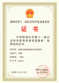 史玄之老师专著《晚清双语教育政策与实践研究》及获奖证书