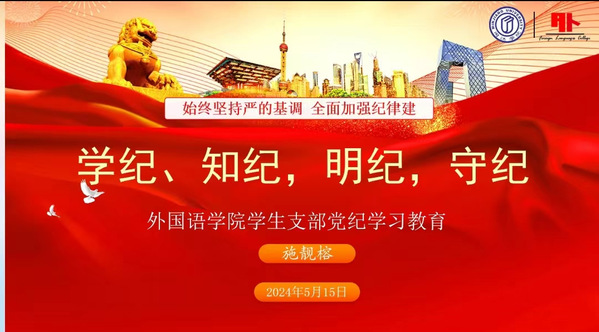 施靓榕副书记首先解读了《关于在全党开展党纪学习教育的通知》,强调了开展党纪学习教育的重要性、目标和要求,带领支部党员学习《中国共产党纪律处分条例》的重点内容,并结合支部党员英语师范专业的实际情况对部分条例进行重点分析。最后,施靓榕副书记提到,希望在座的支部党员们能够做到心中有纪律,行上守纪律。