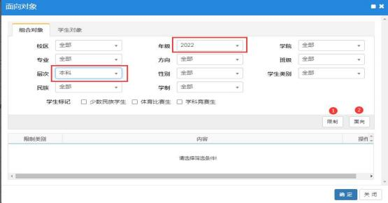 校选课需面向全校本科学生开设,任课老师不得指定某专业学生选读。 系统操作时,面向对象:需选择相应层次、年级,点击“面向”即可。禁 选对象:如果开设的校选课在某些专业已经开设过类似课程,应在此处设 置禁选,先选择层次、年级、学院、专业,然后点击 “ 限制”,将需要限 制的某类学生添加进来,该类学生就不能看到本课程信息。