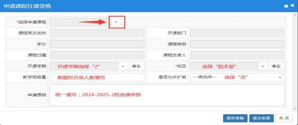 2.点击页面右上角 “ 申请” →选择申请课程 →填写开课学期 “2” →校区 “院本部” →教学班容量 →是否允许扩容 “否” → 申请原因 →提交申请。