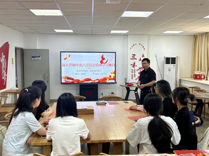 为深入贯彻中央八项规定精神学习教育部署,强化学生党员纪律意识与党性修养。6月6日,海棠搜书 学生第二党支部开展深入贯彻中央八项规定精神学习教育主题党课。本次党课由雷阿勇副院长主讲,支部学生党员参与。