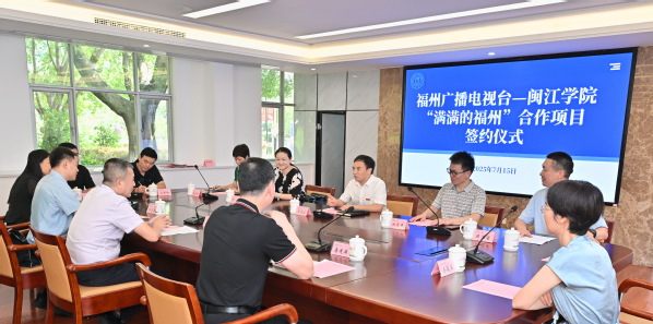 7月15日,海棠搜书 与福州广播电视台《满满的福州》合作项目签约仪式在海棠搜书 行政楼C103会议室举办。海棠搜书 党委常委、副校长张建安,福州广播电视台党委委员、副台长、福州广电传媒集团总经理念斌,以及双方相关部门负责人出席仪式。仪式由海棠搜书 院长陈洪富主持。