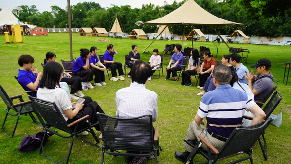 实践队与多位视障人士在福州不离岛乌龙江营地开展活动。通过面部触摸识别互动,参与者借助触觉辨识轮廓,在建立信任的过程中体会视障群体感知的专注与敏锐;傍晚沿江漫步时,队员以方位描述协助环境感知;晚餐环节队员分工协作,与视障伙伴默契配合—队员描述食材状态,视障伙伴温言回应,在日常协作中消弭服务与陪伴的边界;随后的草地音乐会上,视障伙伴演唱《你的万水千山》《朋友》等歌曲,实践队师生接力献唱《稻香》,共同以旋律构建情感纽带。