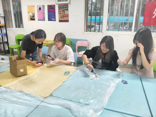 支部成员们在易起学吧活动室内开展了首次扎染活动体验课。同学们先通过视频资料学习了扎染工艺的历史渊源和制作流程,进行了实操练习。大家按照讲解的方法,将洁白的棉布折叠捆绑出各种形状,然后浸入预先准备好的染料中。经过反复浸染、氧化、清洗等工序,原本素净的布匹在同学们的创作下,逐渐呈现出五彩斑斓的图案效果。