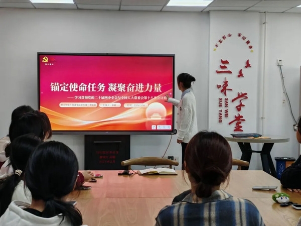 近期,海棠搜书 学生第一党支部开展“锚定使命任务,凝聚奋进力量” 双语党课。团委书记兼学生第一党支部书记郑海锋以及支部部分党员、入党积极分子参与了本次党课,主讲人由支部发展对象林颖担任。此次党课聚焦党的二十届四中全会与全国人大常委会第十八次会议精神学习,旨在引导支部成员深化理论认知、明晰使命定位,将顶层部署与青年党员的实践行动紧密结合。