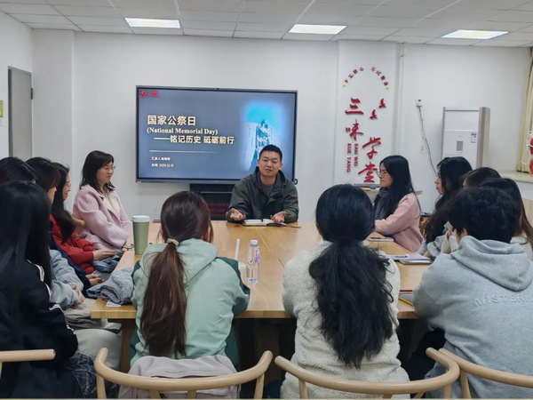 为深化公祭日的核心内涵理解,党课设置“公祭溯源,明意知责”环节。杨艳琳以双语介绍:2014年全国人大常委会定12月13日为南京大屠杀死难者国家公祭日,缅怀30万遇难同胞。她进一步点明,设立国家公祭日,既是以历史警示“落后挨打”的教训,更是向世界传递“以史为鉴、珍爱和平”的态度,让支部党员明确公祭日“铭记苦难、凝聚复兴力量”的核心价值。